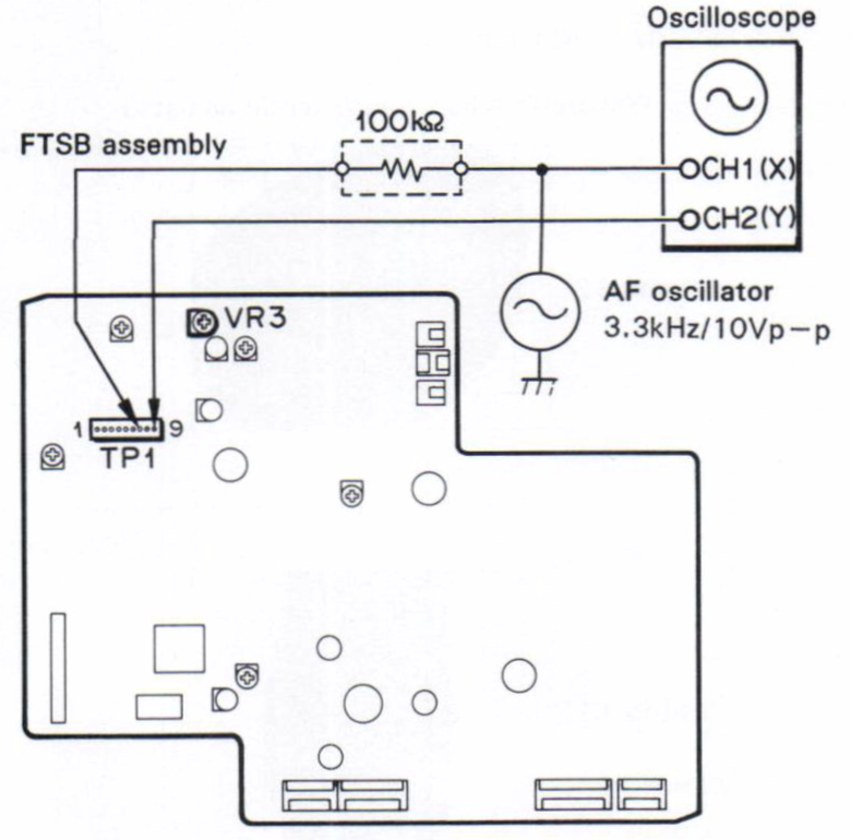Adjust VR3 until the waveform is symmetrical in both the X and Y axis. The following trace shows an incorrectly adjusted VR3: