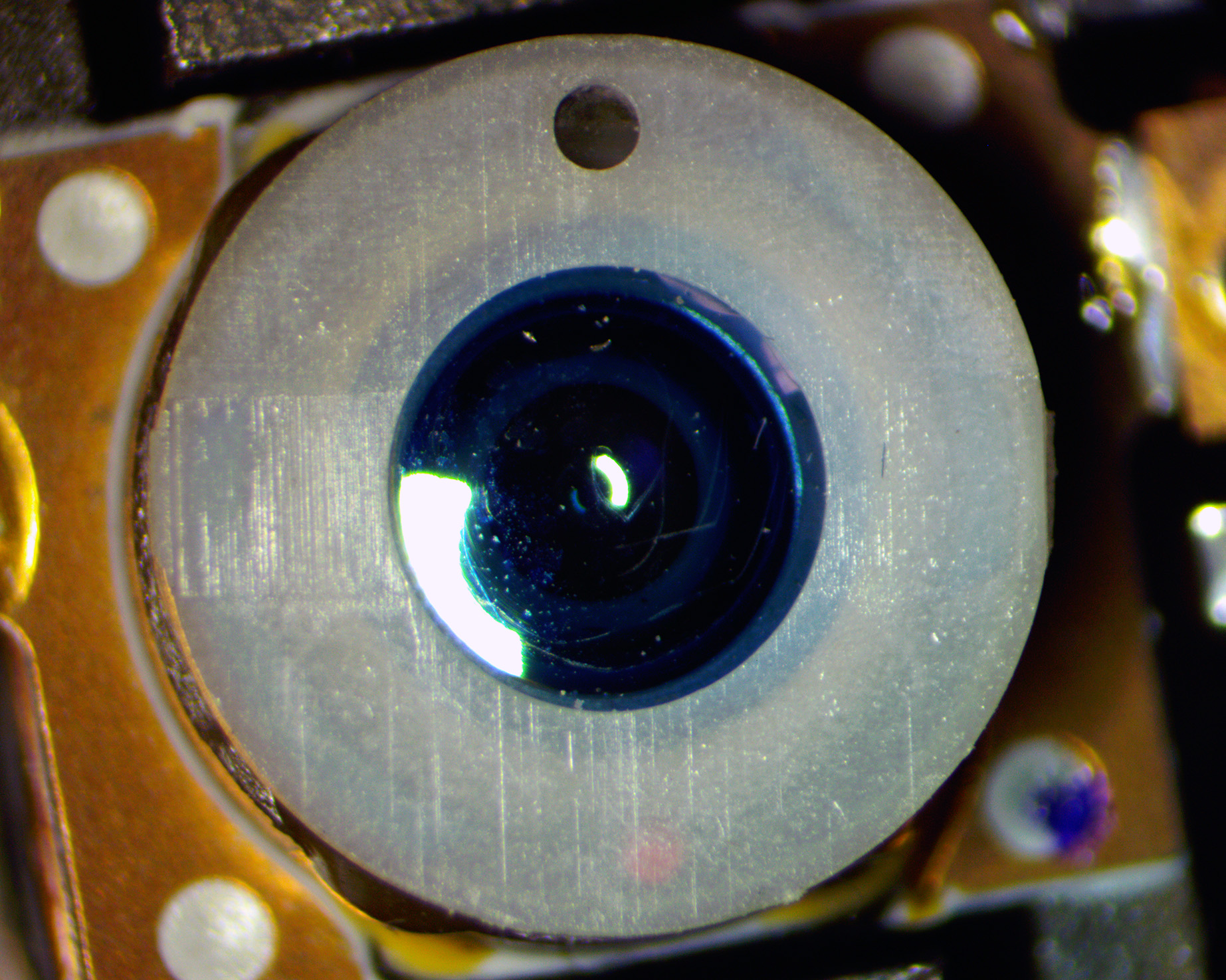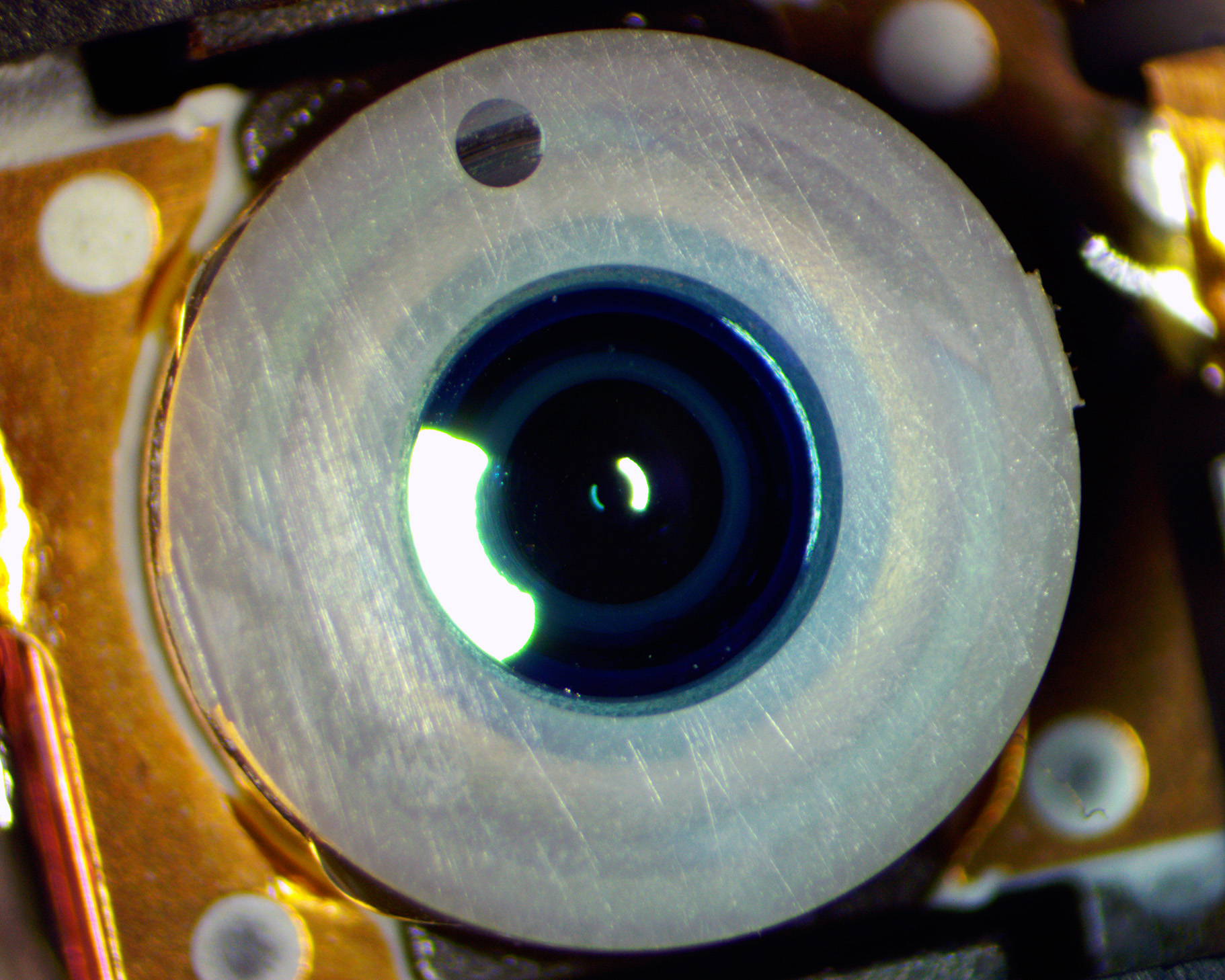If there are any scratches visible on the lens surface the lens will required replacement before calibration. Although calibration may be possible, a damaged lens will severely effect the player’s noise levels causing poor playback. The following picture shows an example of a lens which has been damaged by spinning debris during use: