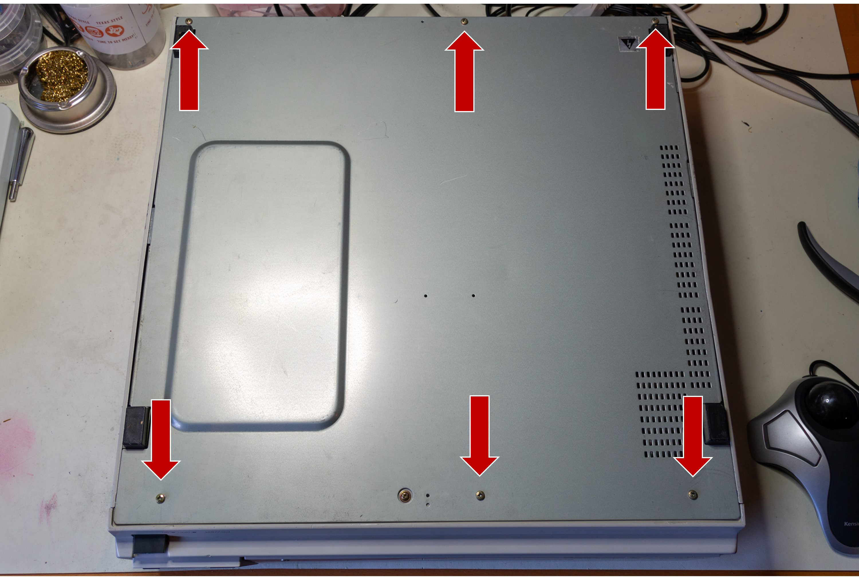 Next remove the 6 screws at the sides of the case (3 on each side) as shown in the following picture:
