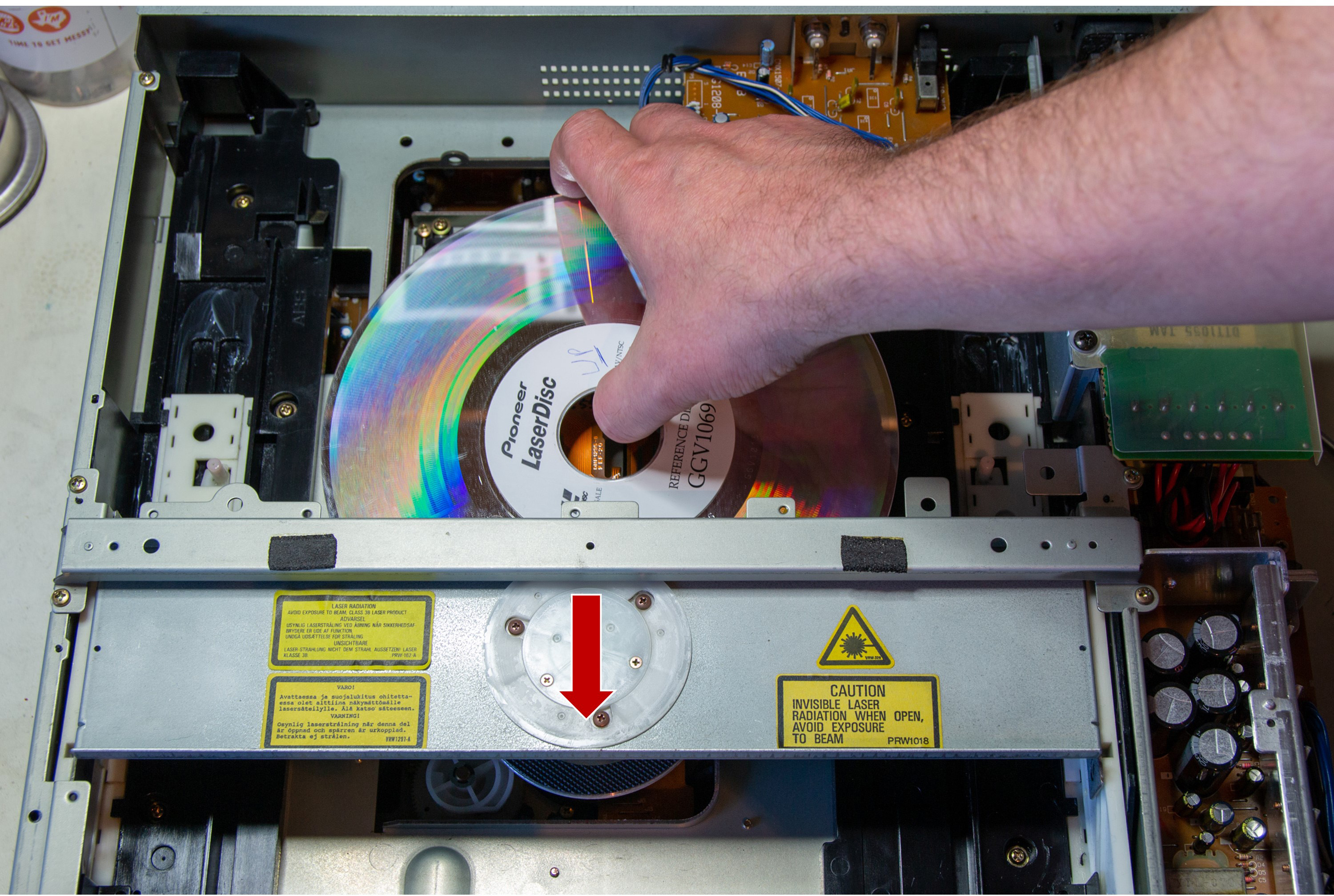Once clamped, the disc should be able to rotate freely on the spindle. Note that, when the player is first power up (with the disc tray removed) the player will think that the tray is ejected and attempt to load the tray. This should be stopped by briefly pressing the tray closed microswitch at the back-right of the player (under the external sync board).