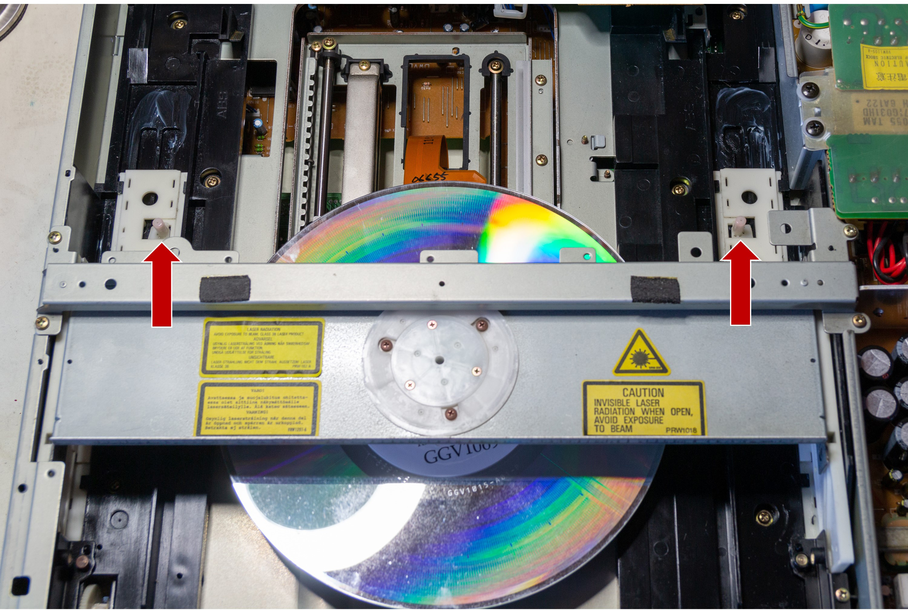 Once the disc is in place on the player’s spindle push up the two white levers to clamp the disc in place as shown in the following picture: