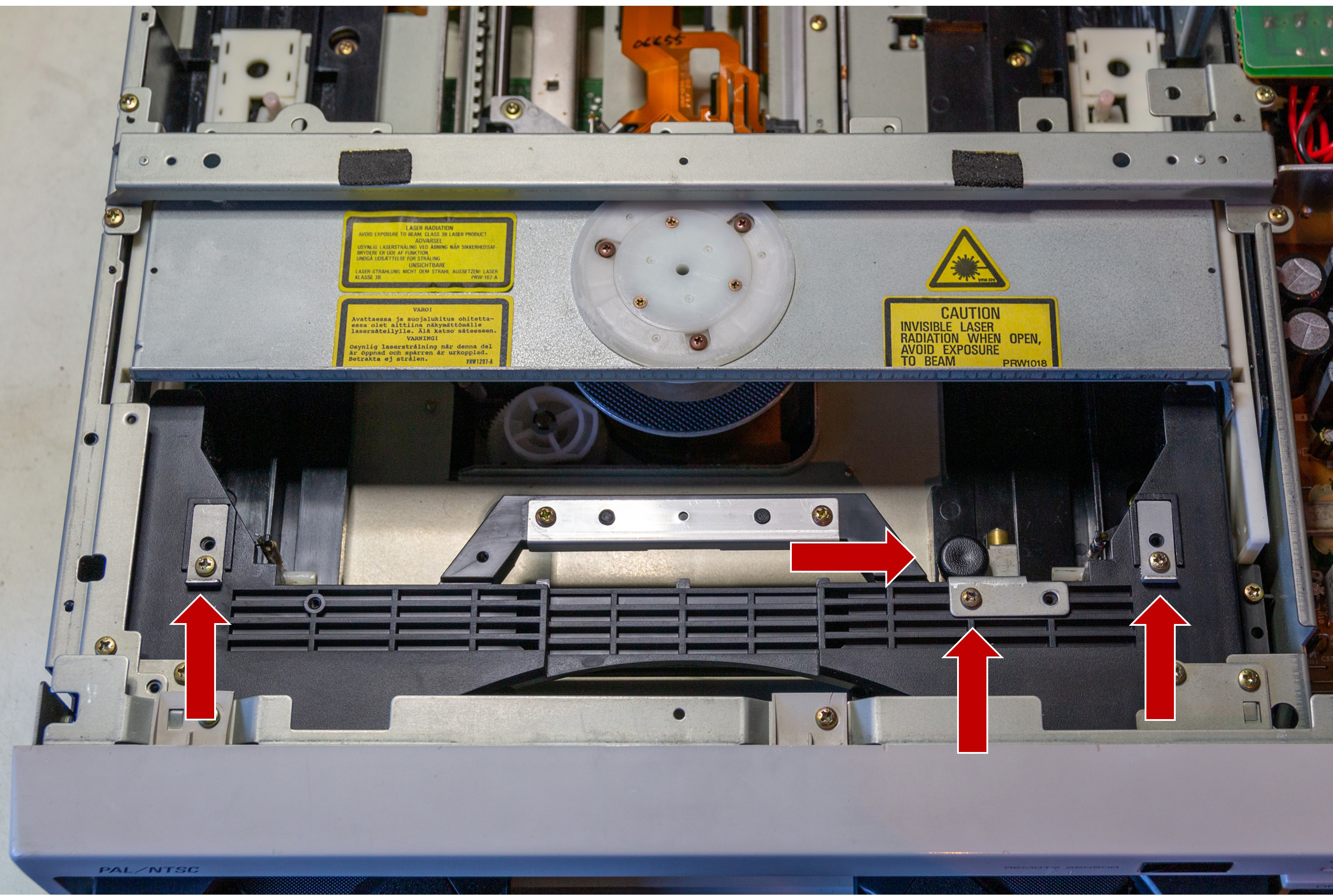 Next flip the player back over, power up and eject the disc tray (be very careful of the live power supply when operating the player without a case!). Once the tray is ejected remove the three screws and the plastic plunger indicated in the following picture:
