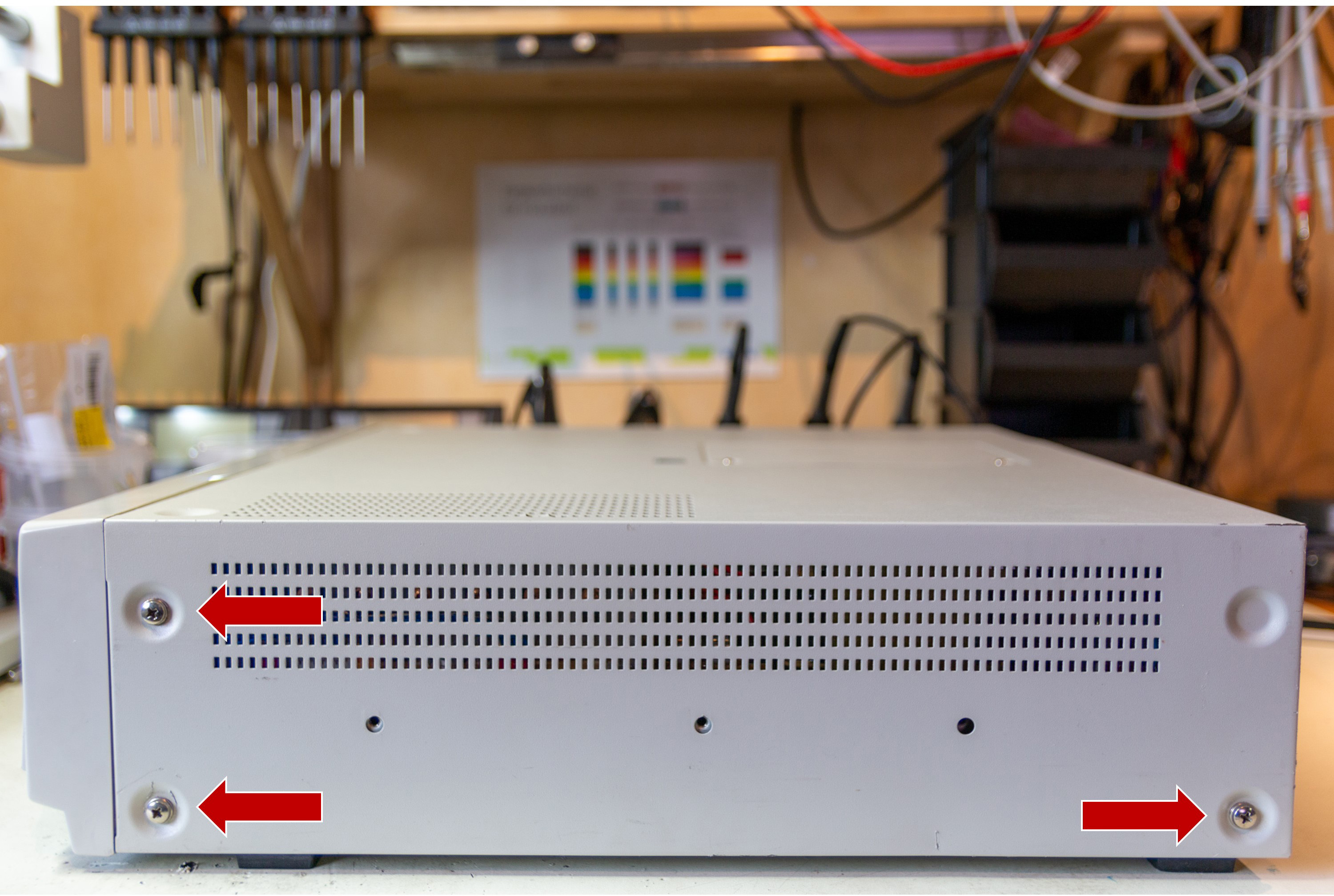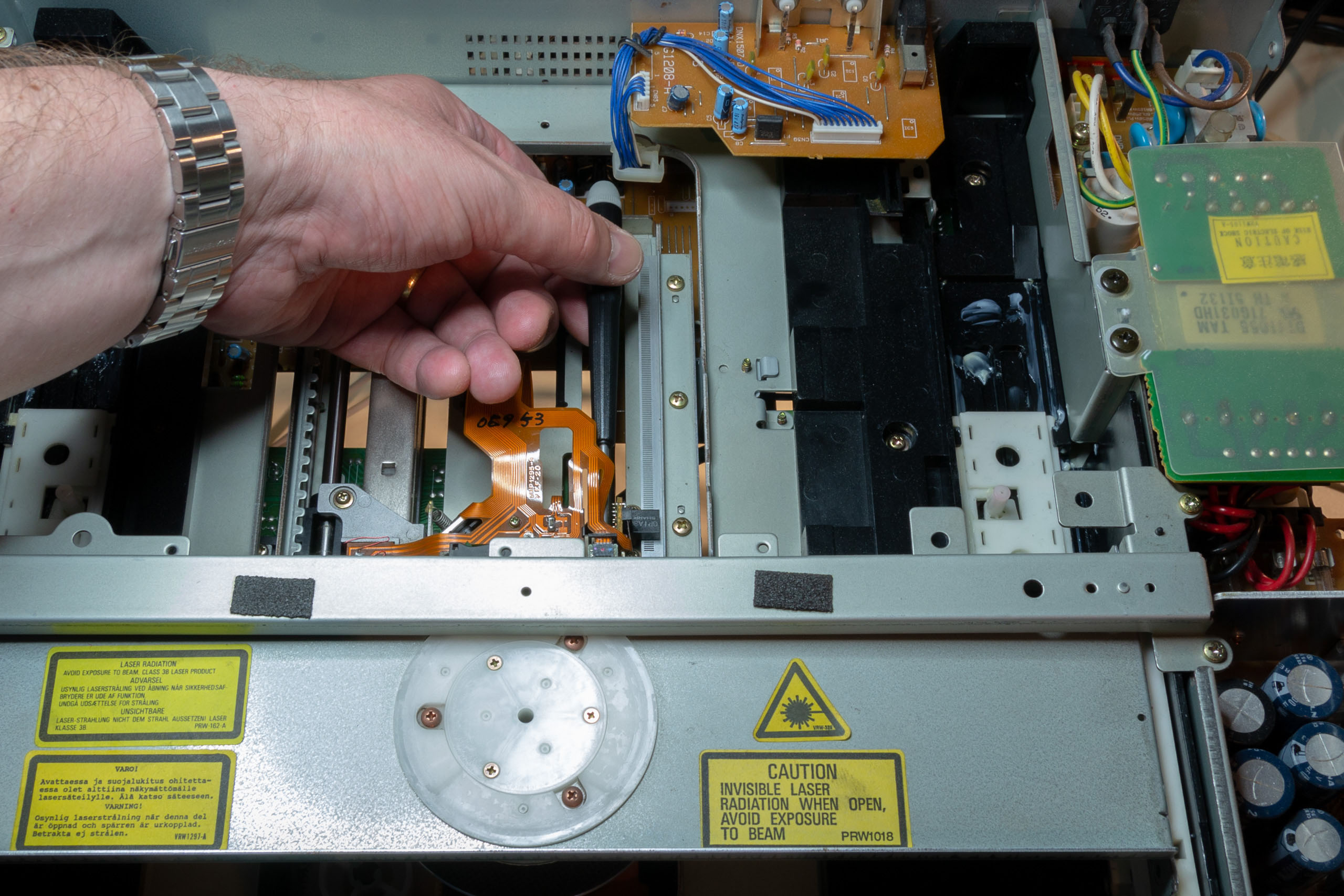 Many of the adjustments require you to access the underside of the player to reach the adjustment screws and potentiometers. When the player is horizontal on the workbench lift from the left side of the player so the power supply (on the right) is on the bench when the left side is raised. This lowers the chances of you putting your fingers into the live power supply during calibration. Putting your fingers inside the power supply during testing will lead to a very quick end to your adventures in player maintenance and repair. Be very careful of the power supply at all times.