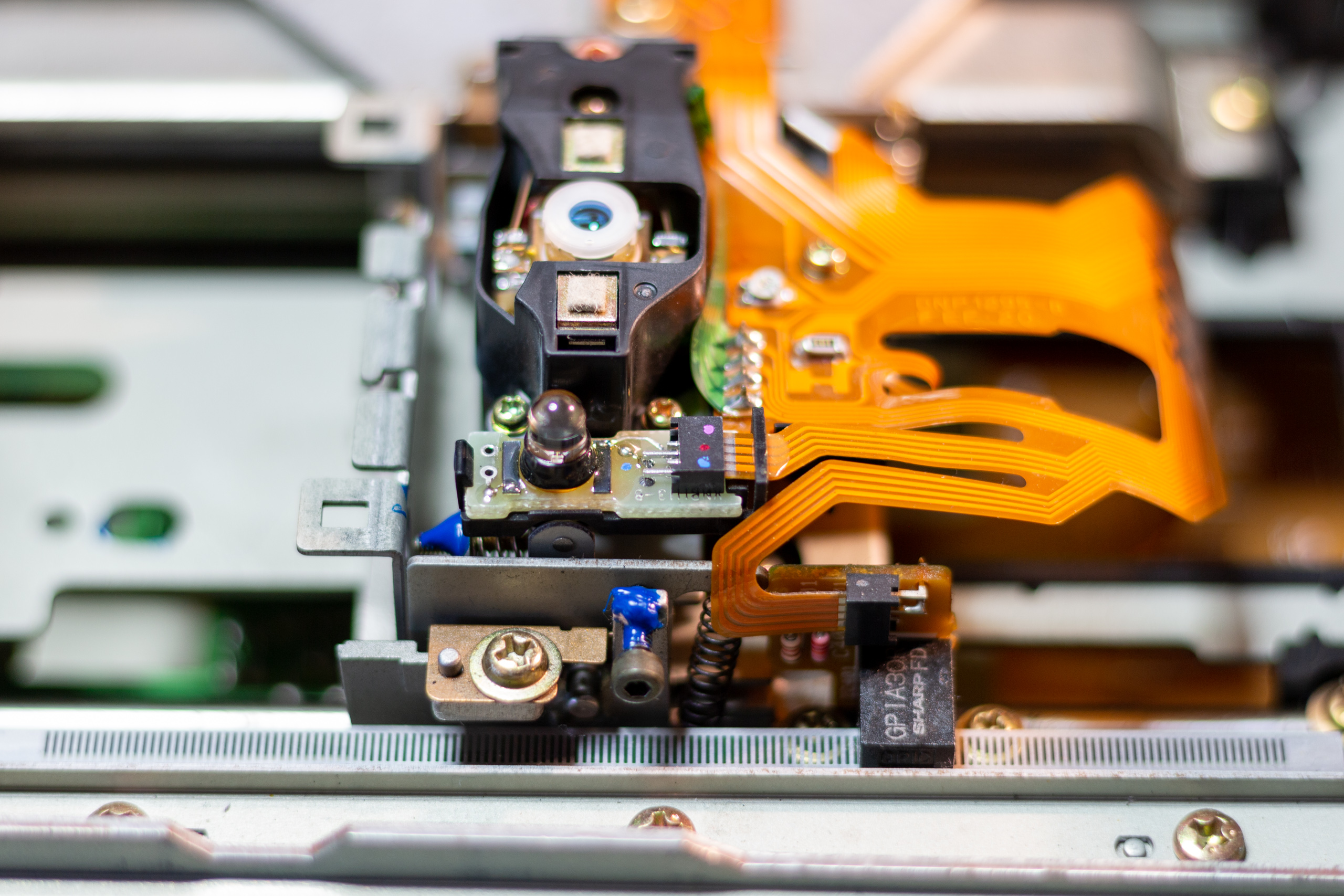 The laser diffraction grating is an optical component responsible for splitting the laser beam and must be correctly aligned to ensure the laser output (at the lens) is correct. Incorrect setting can cause playback to be impossible or can make the player jump tracks randomly during playback.