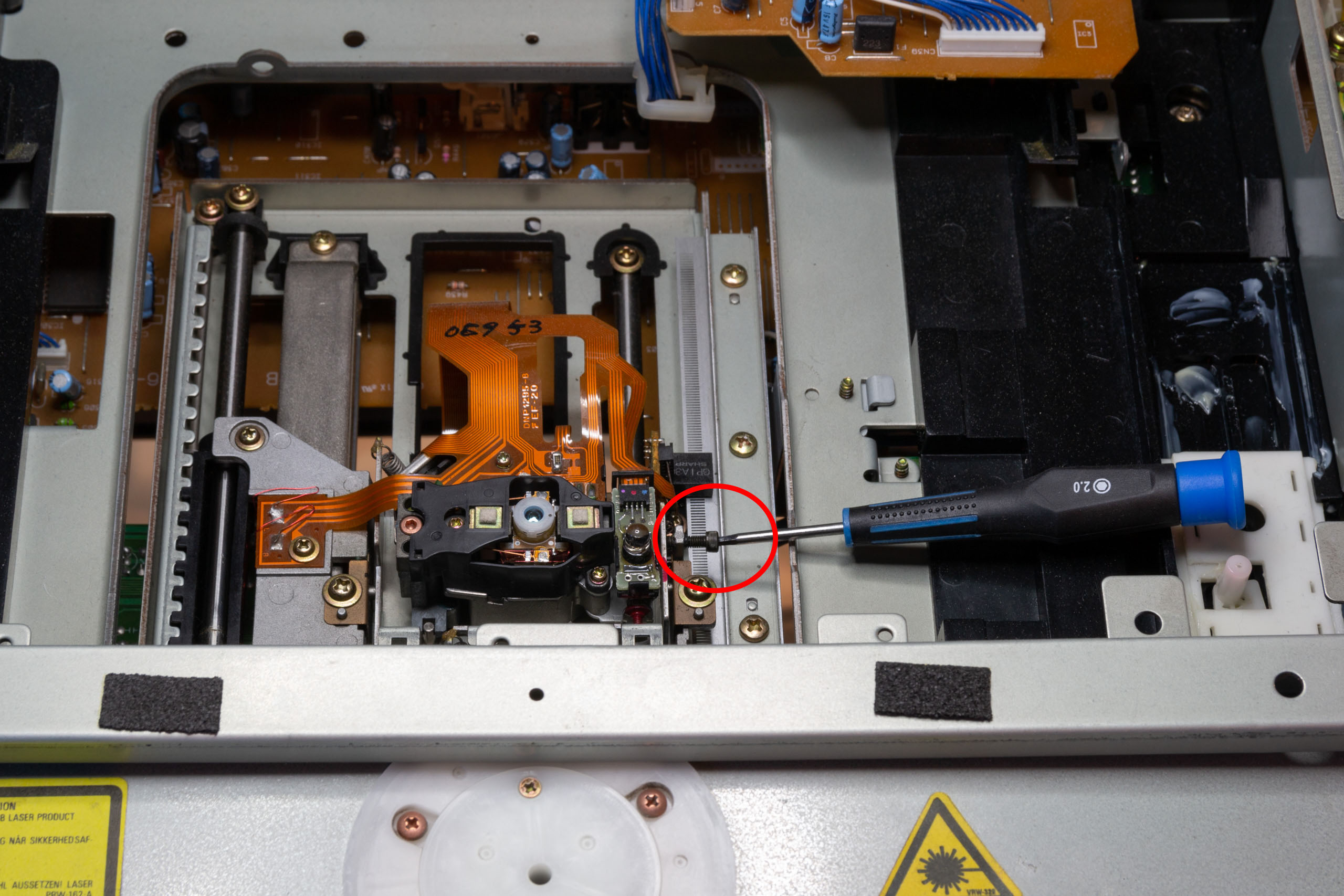 CAUTION: If you haven’t performed this calibration step before it is recommended to remove the optical deck and get a good look at the calibration point before reassembling and adjusting. It can be very difficult to get a ‘feel’ for the adjustment without making yourself very familiar with the construction and shape of the adjustment point. If in doubt, skip this calibration step.