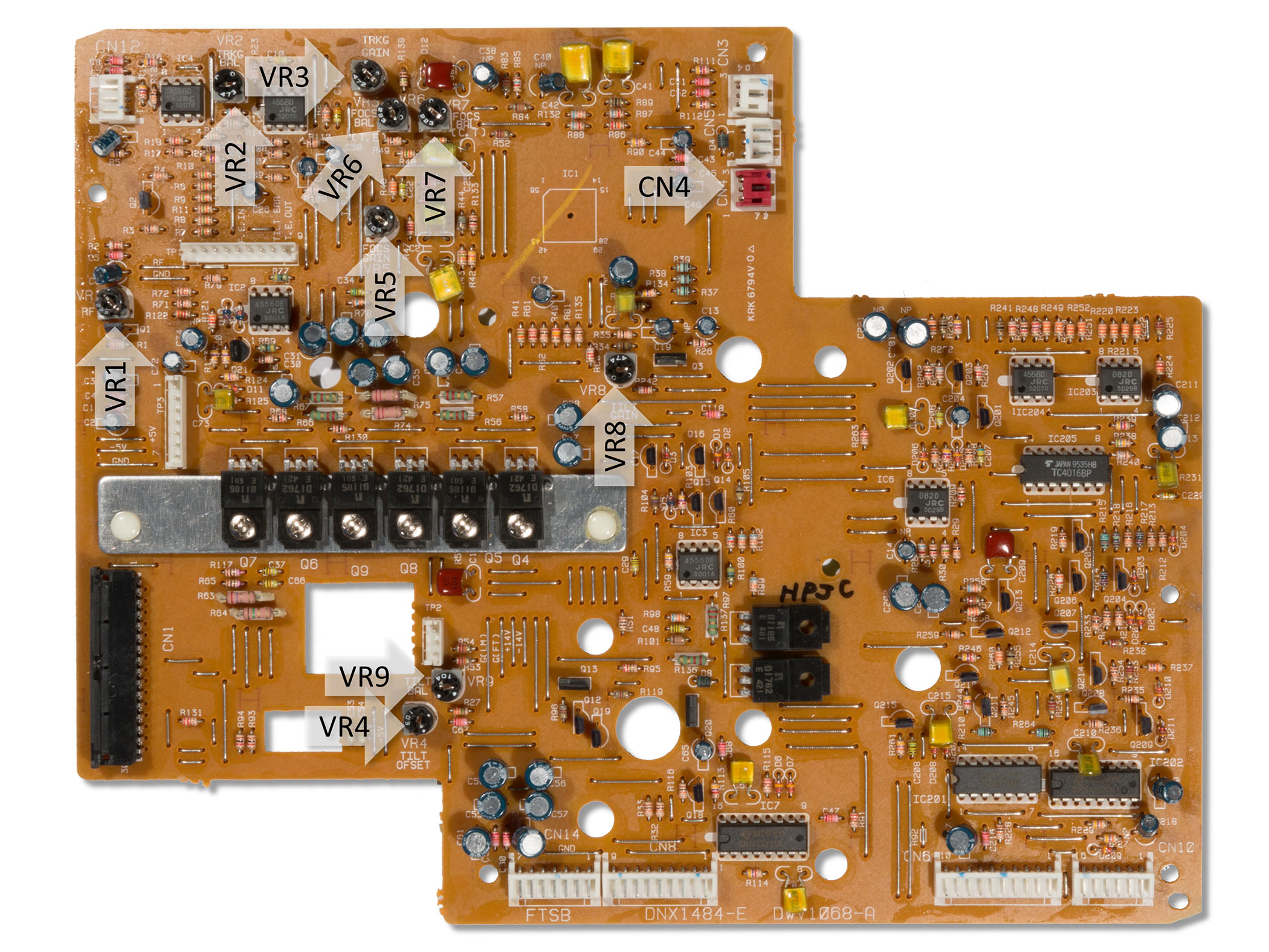 Once your mechanical adjustment is as close as possible read the current signal level and make a note ‘A’. Now lift the player on to it’s side. Take another measurement ‘B’. Then calculate B - A = C. Now adjust VR4 to the value of ‘C’ (i.e. A = 256, B = 1152, 1152 - 256 = 896). Then place the player horizontally again and ensure that the signal is as close to 0V as possible. Once you are within +- 200mV the calibration is complete. If the adjustment is incorrect, repeat the adjustment again (without resetting the position of VR4).