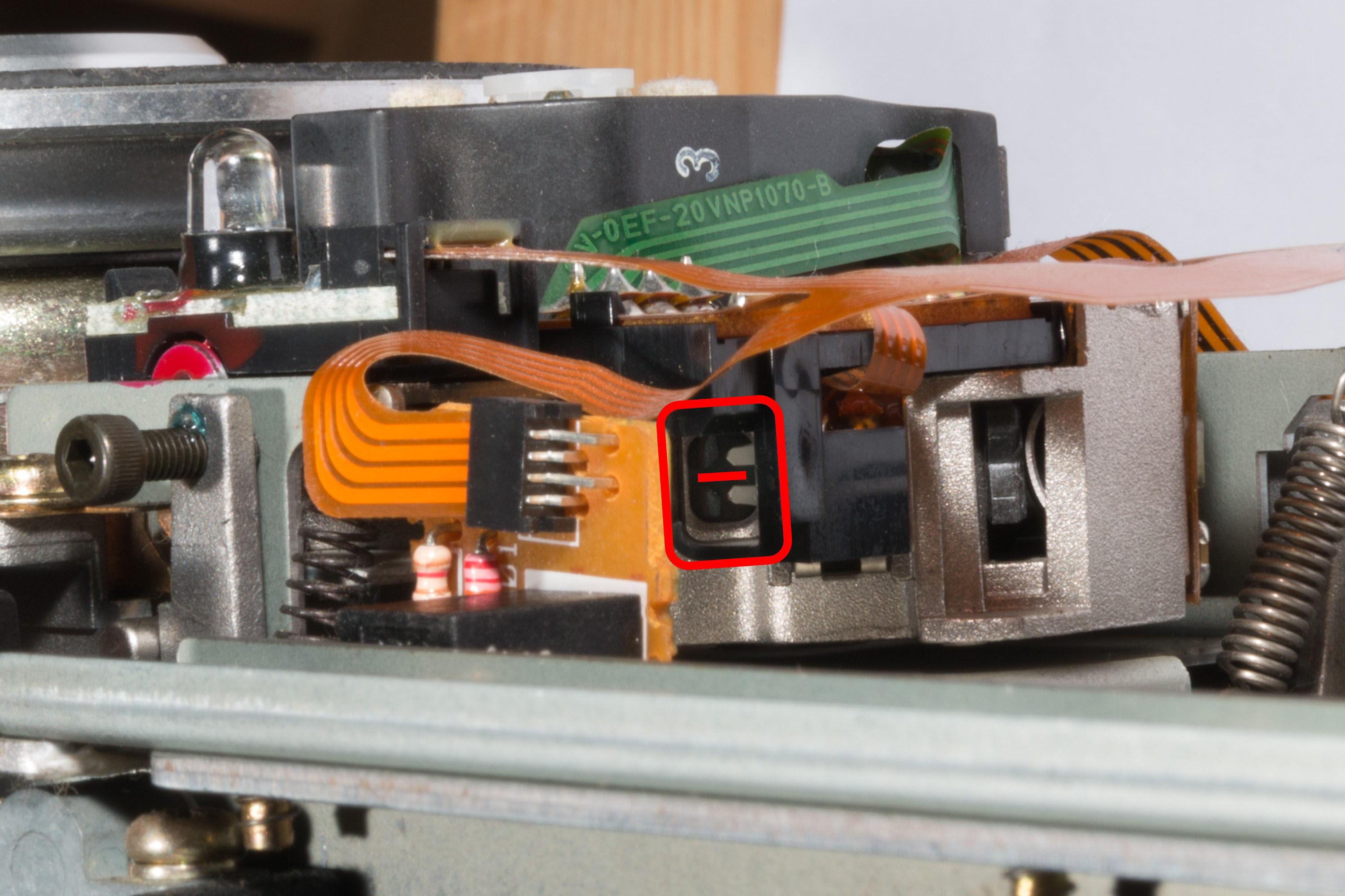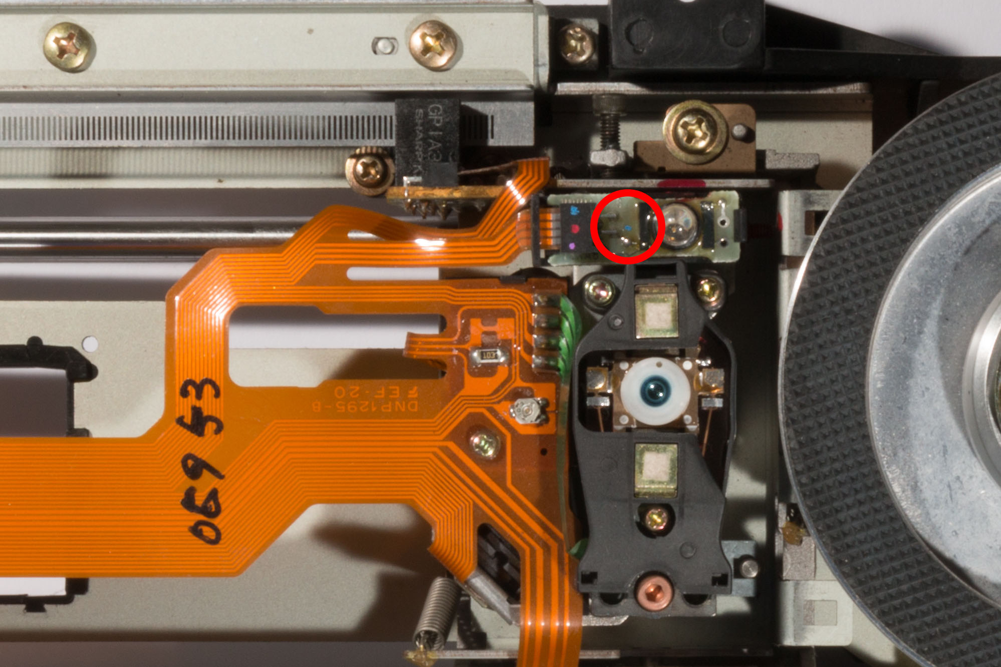 The tilt sensor is a small photodiode located to the right of the lens which detects the proximity of the assembly to the LaserDisc. When manufactured the tilt sensor is given a ‘gain rank’ indicated by a coloured dot on the tilt sensor PCB as shown in the following picture: