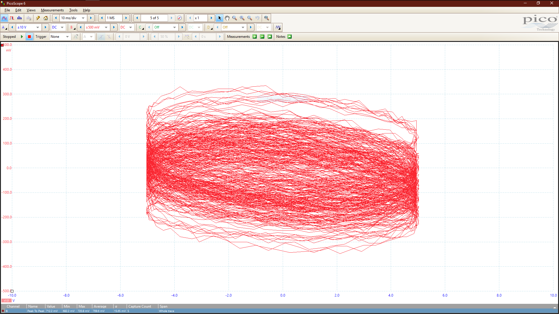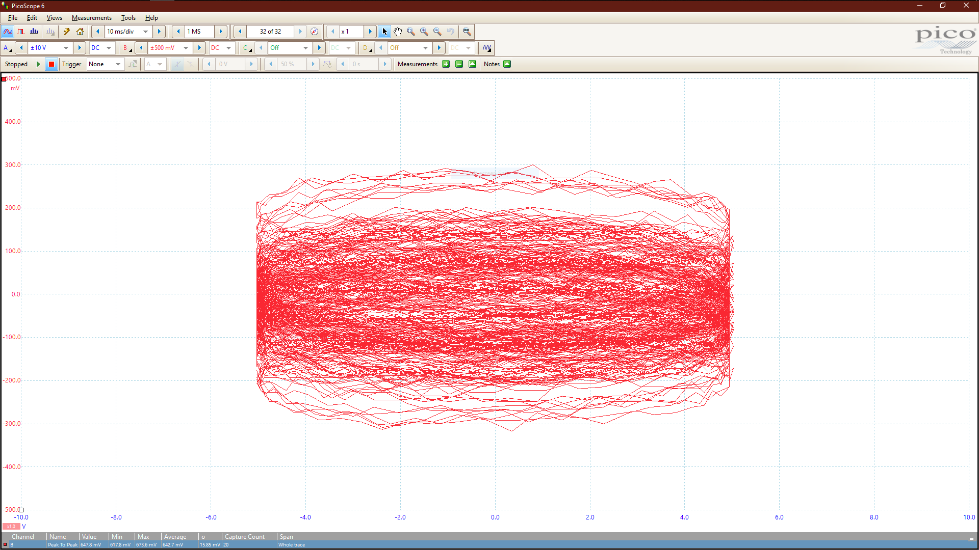 The observed waveform should be both as flat as possible (minimum Y-axis PtP) and as equal as possible on frames 1,000 and 20,000. The following scope trace shows a badly adjusted centering point: