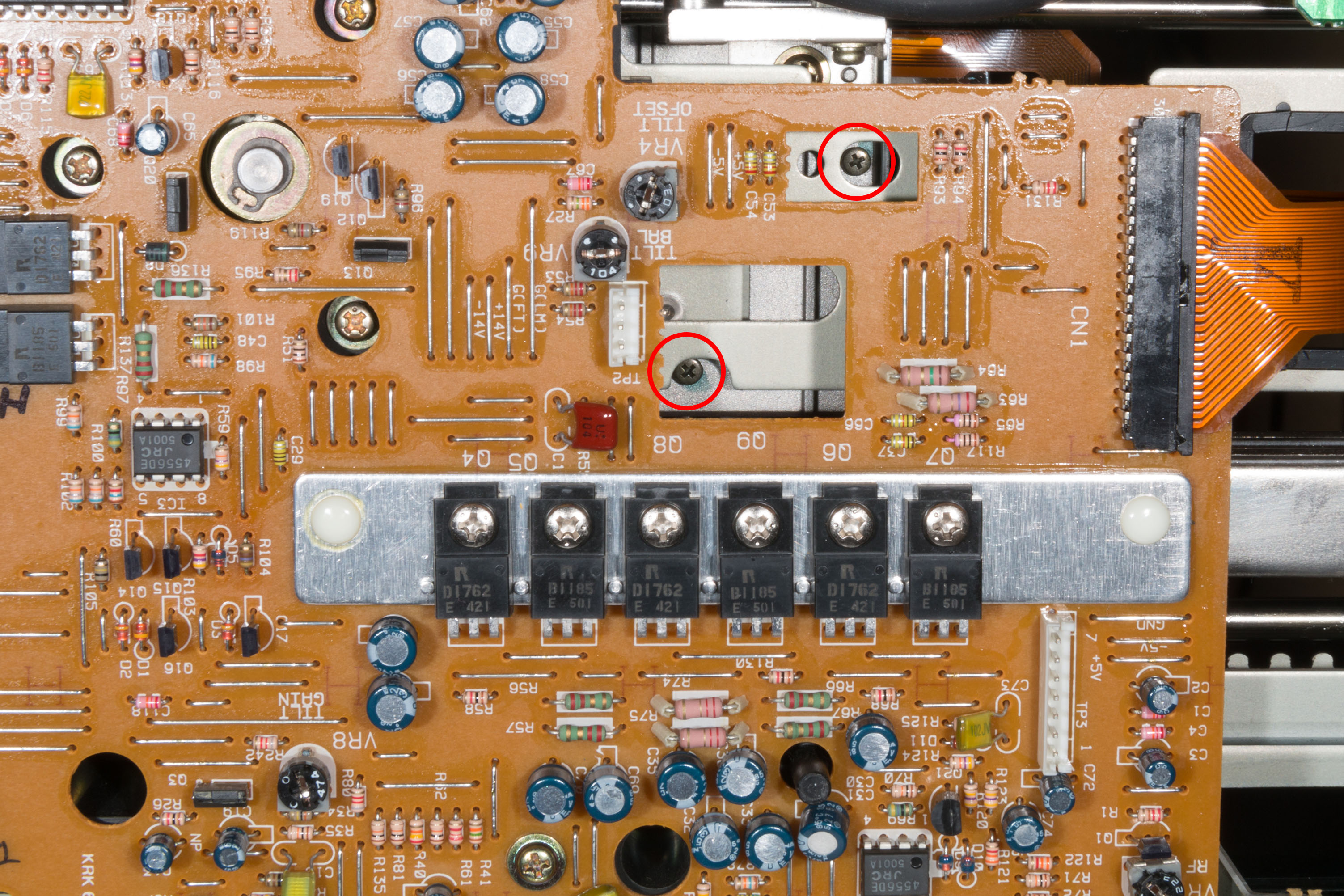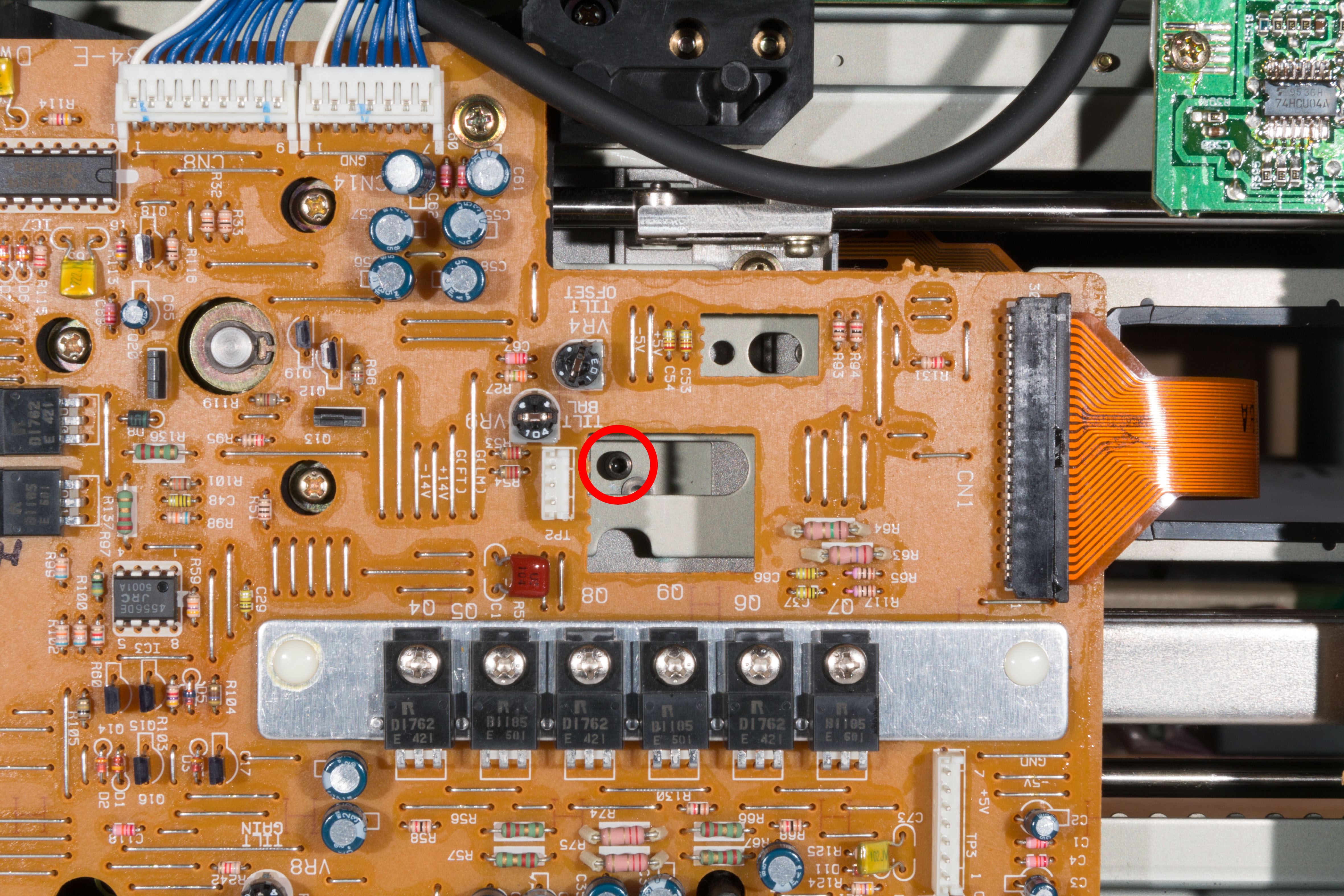 The tilt sensor controls the tilt angle of the optical deck during playback. Detection of the disc angle is performed by a photodiode; as the angle of the disc moves from perpendicular (to the deck) the reflected light decreases, so the player moves the tilt angle to compensate. This calibration step sets the physical angle of the tilt sensor and the balance of the photodiode (VR4).