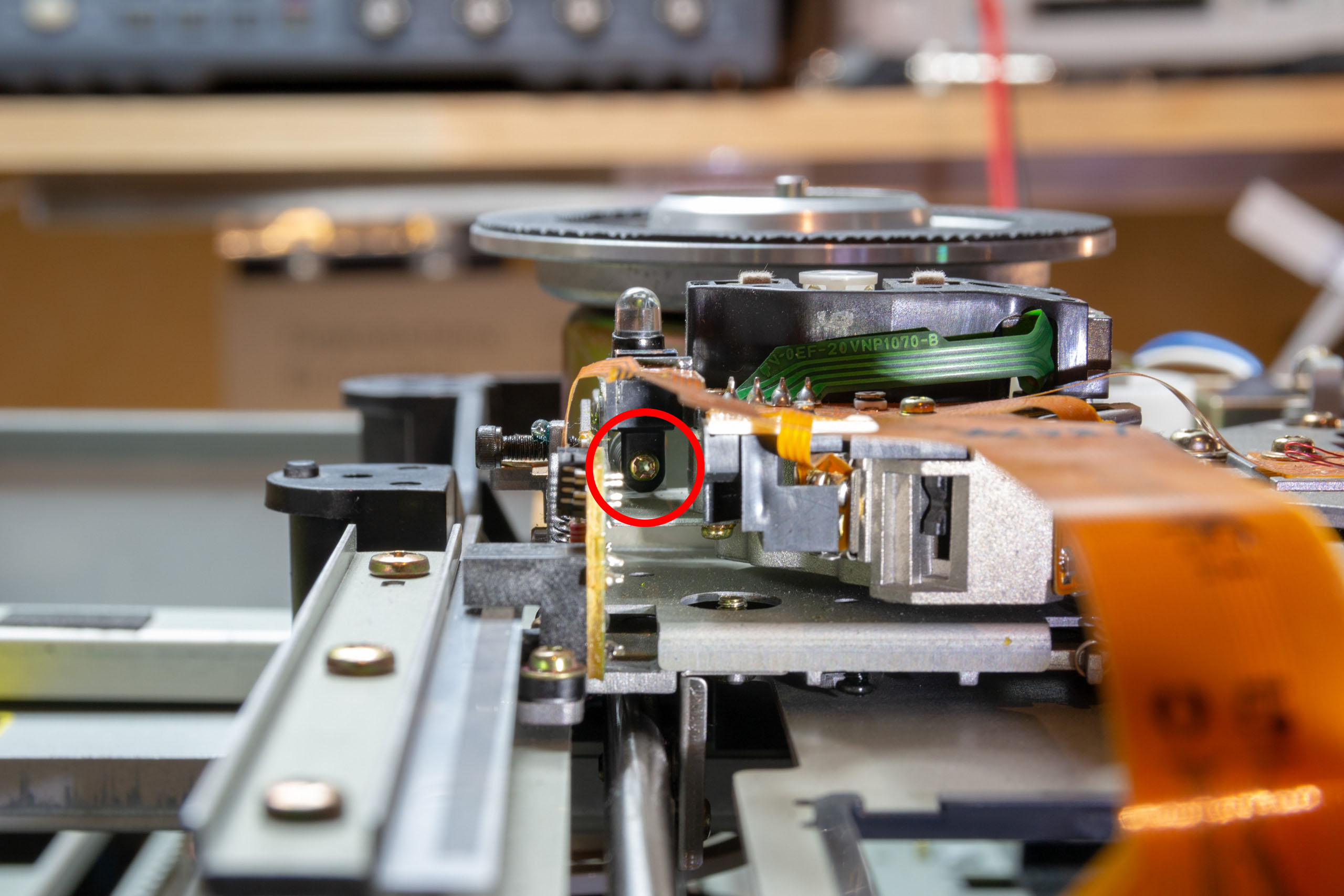 Lift the player on to it’s side and set VR4 to it’s mechanical centre point. Then set the player horizontal and adjust the tilt adjustment screw as shown in the following picture: