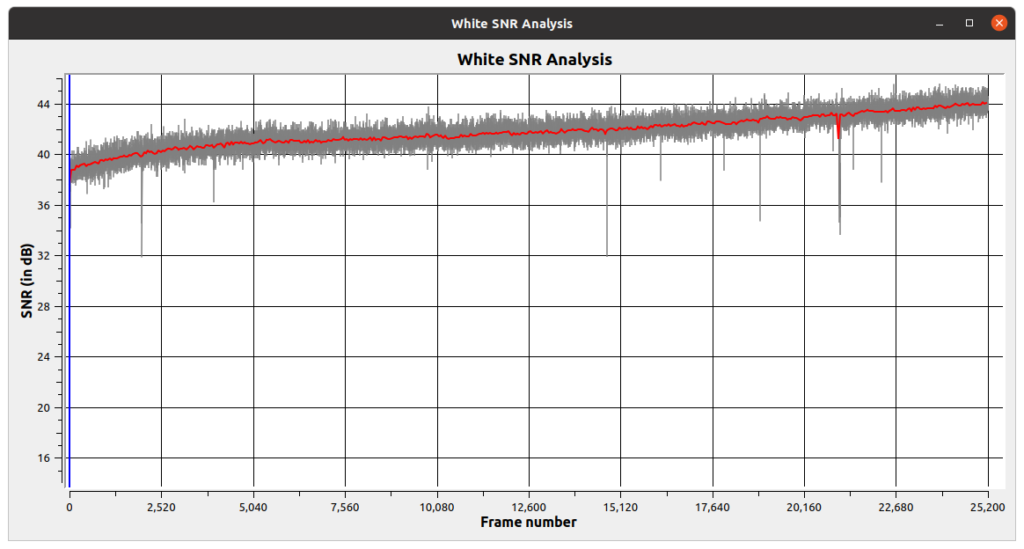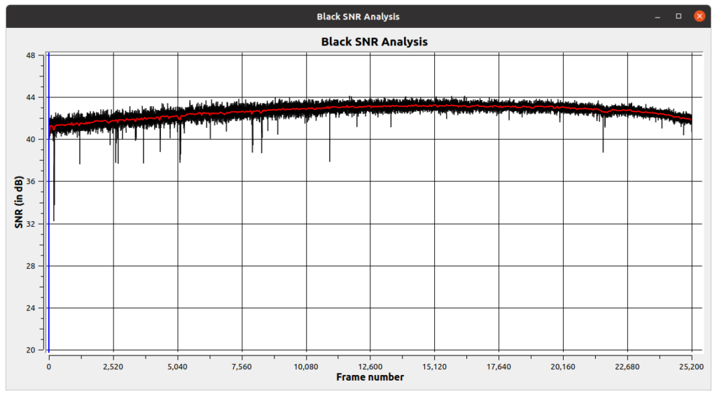 If you have access to a Domesday Duplicator board and ld-decode you can verify the calibration by capturing the GGV1069 disc and decoding the contents. The ld-analyse application will provide you with a graph of the SNR performance across the disc. The following chart is an example SNR graph from a calibrated player (note: LaserDisc players are analogue devices - there will always be variance between them regardless of the calibration):