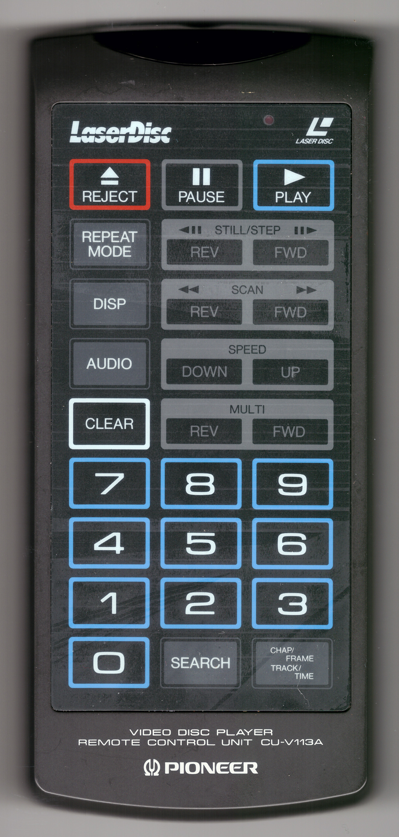 The Pioneer CU-V113A consumer remote control can be used to control the LD-V4300D. The remote control is shown in the following image: