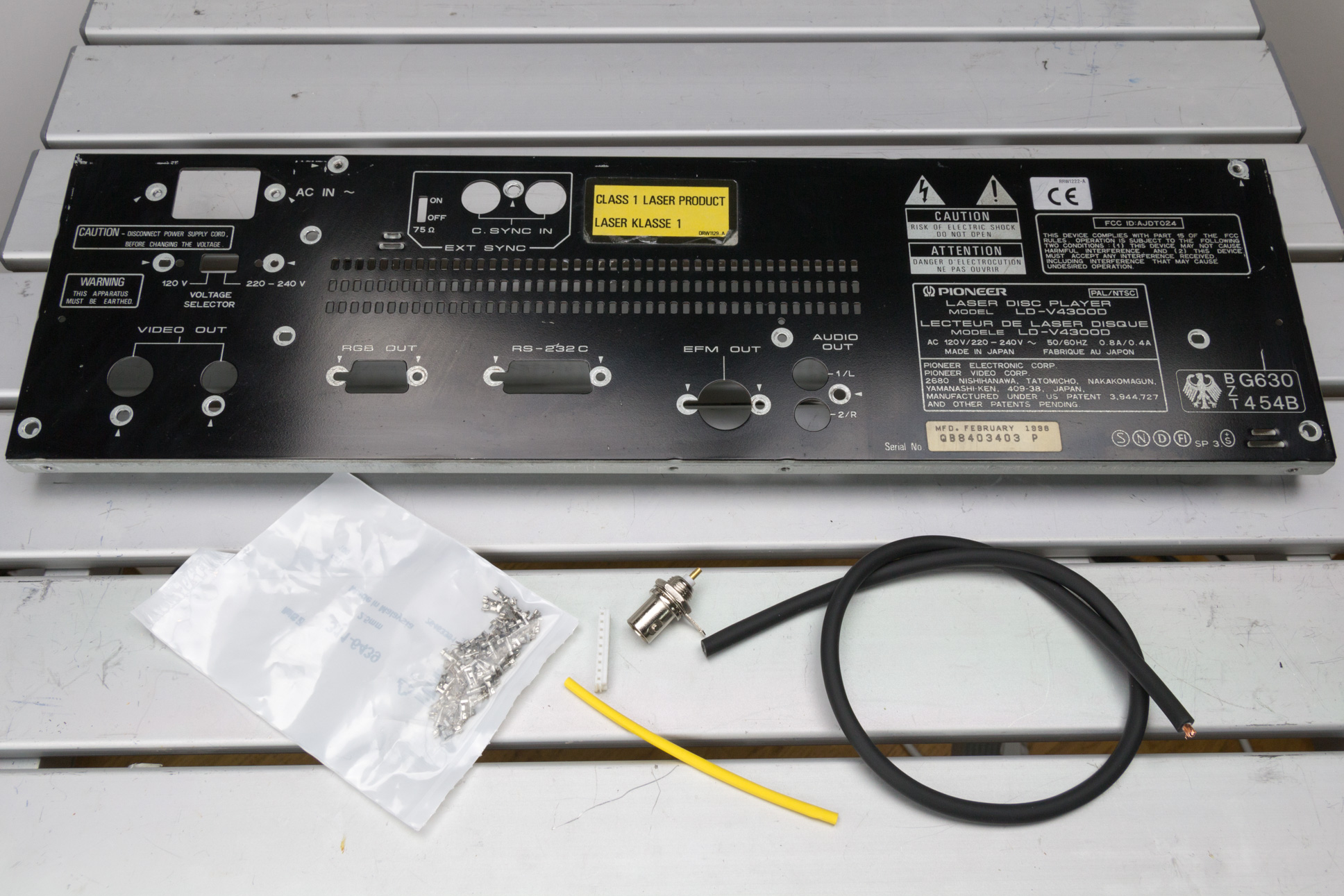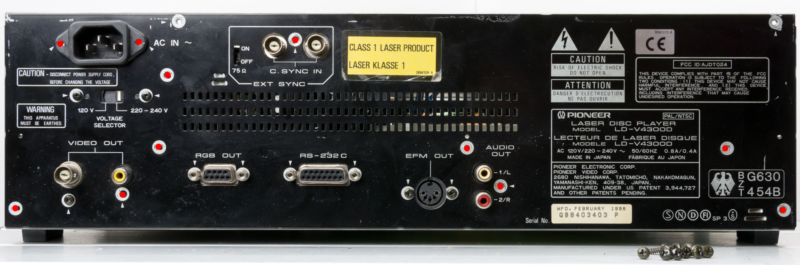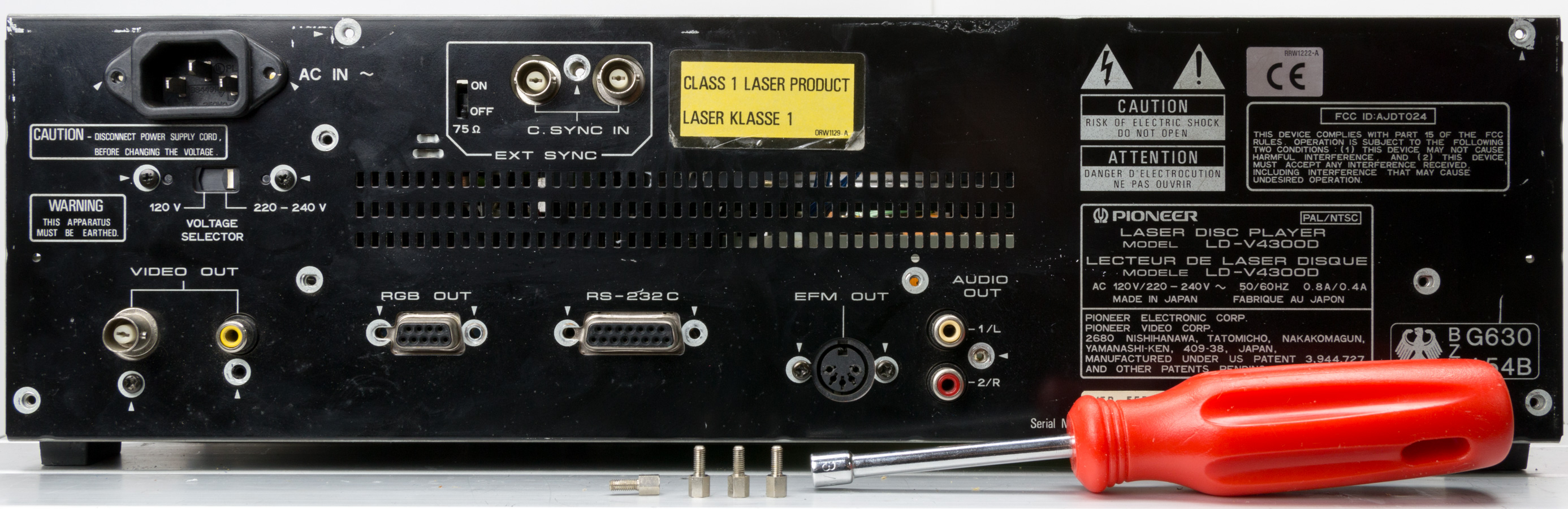 In order to use the Pioneer LD-V4300D with the Domesday Duplicator, it is necessary to add an ‘RF tap’ to the player. This is simply a BNC connector that outputs the raw RF from the LaserDisc player’s optical assembly. Like most LaserDisc players the LD-V4300D exposes the RF signal as a test-point in the player. In this article we will remove the back panel, fit a new BNC connector and wire the connector up to the correct test-point in the player. Note that it is possible to make a simple cable to tap the RF (without modifying the back panel of the player) however, since the addition of the RF BNC does not effect normal operation, it’s a better (safer) idea to mount the new connector so the player can be fully assembled for operation.