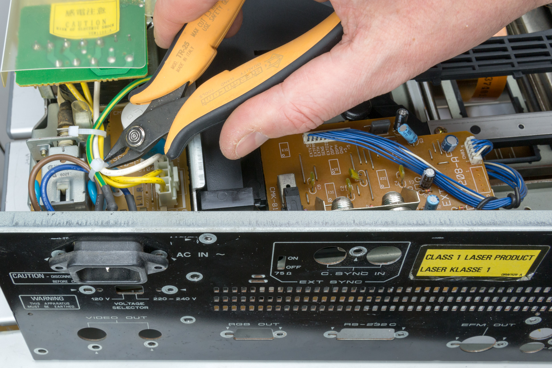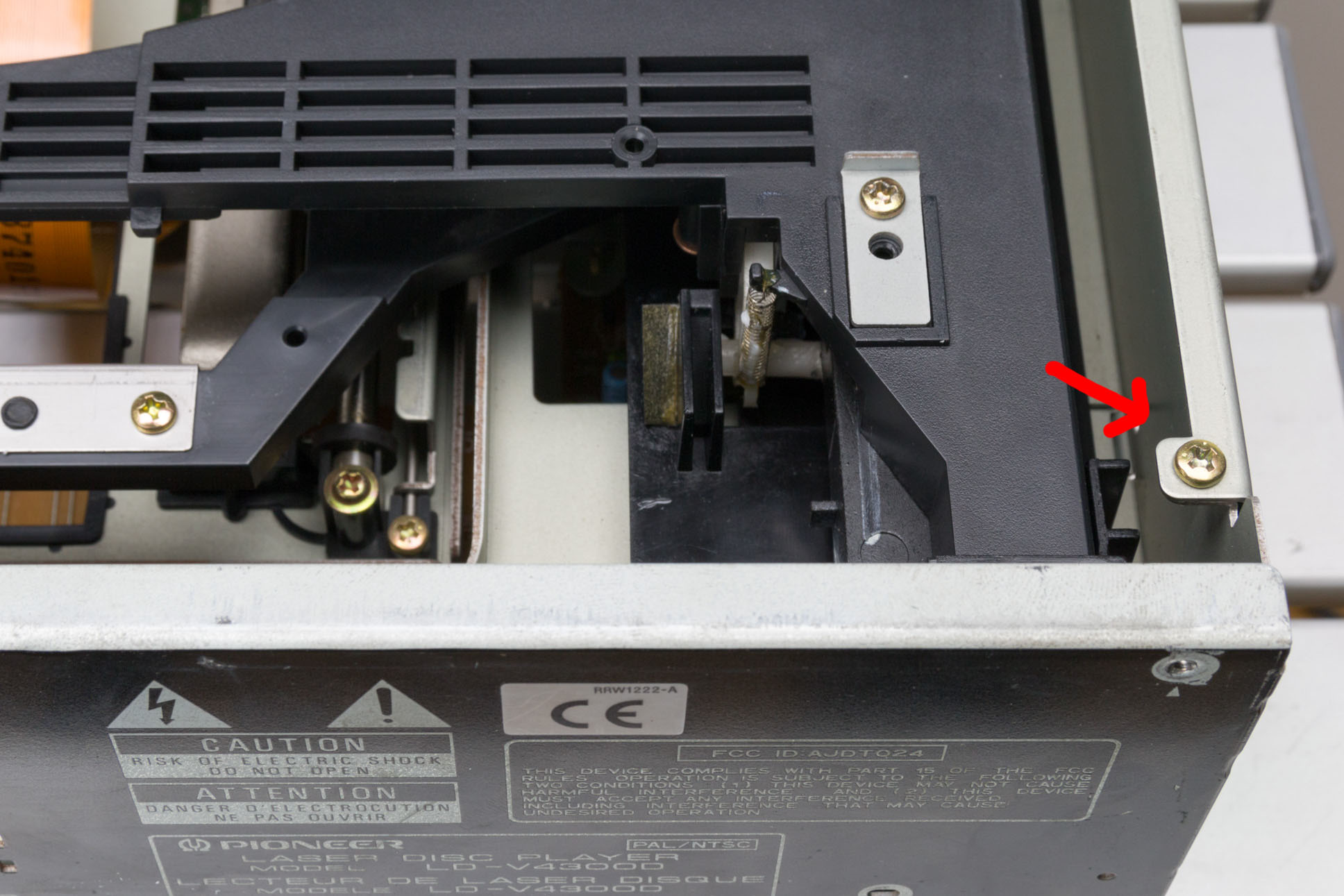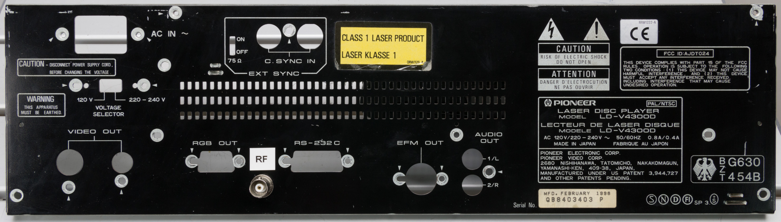 In order to use the Pioneer LD-V4300D with the Domesday Duplicator, it is necessary to add an ‘RF tap’ to the player. This is simply a BNC connector that outputs the raw RF from the LaserDisc player’s optical assembly. Like most LaserDisc players the LD-V4300D exposes the RF signal as a test-point in the player. In this article we will remove the back panel, fit a new BNC connector and wire the connector up to the correct test-point in the player. Note that it is possible to make a simple cable to tap the RF (without modifying the back panel of the player) however, since the addition of the RF BNC does not effect normal operation, it’s a better (safer) idea to mount the new connector so the player can be fully assembled for operation.