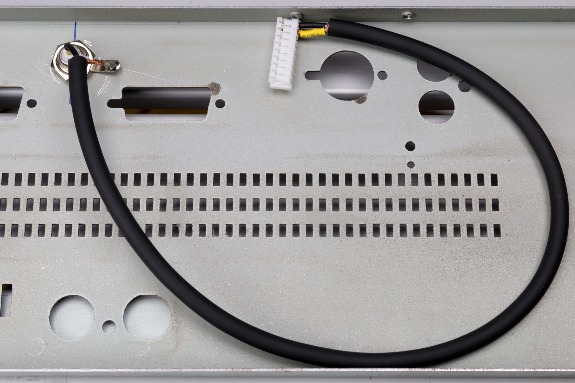 Now reassemble the back panel onto the player (making sure you get the correct screws in the right places as noted above). Once the back panel is assembled, connect the RF tap cable to the test point connector and then zip-tie the new cable to ensure it doesn’t get snagged as the player is reassembled: