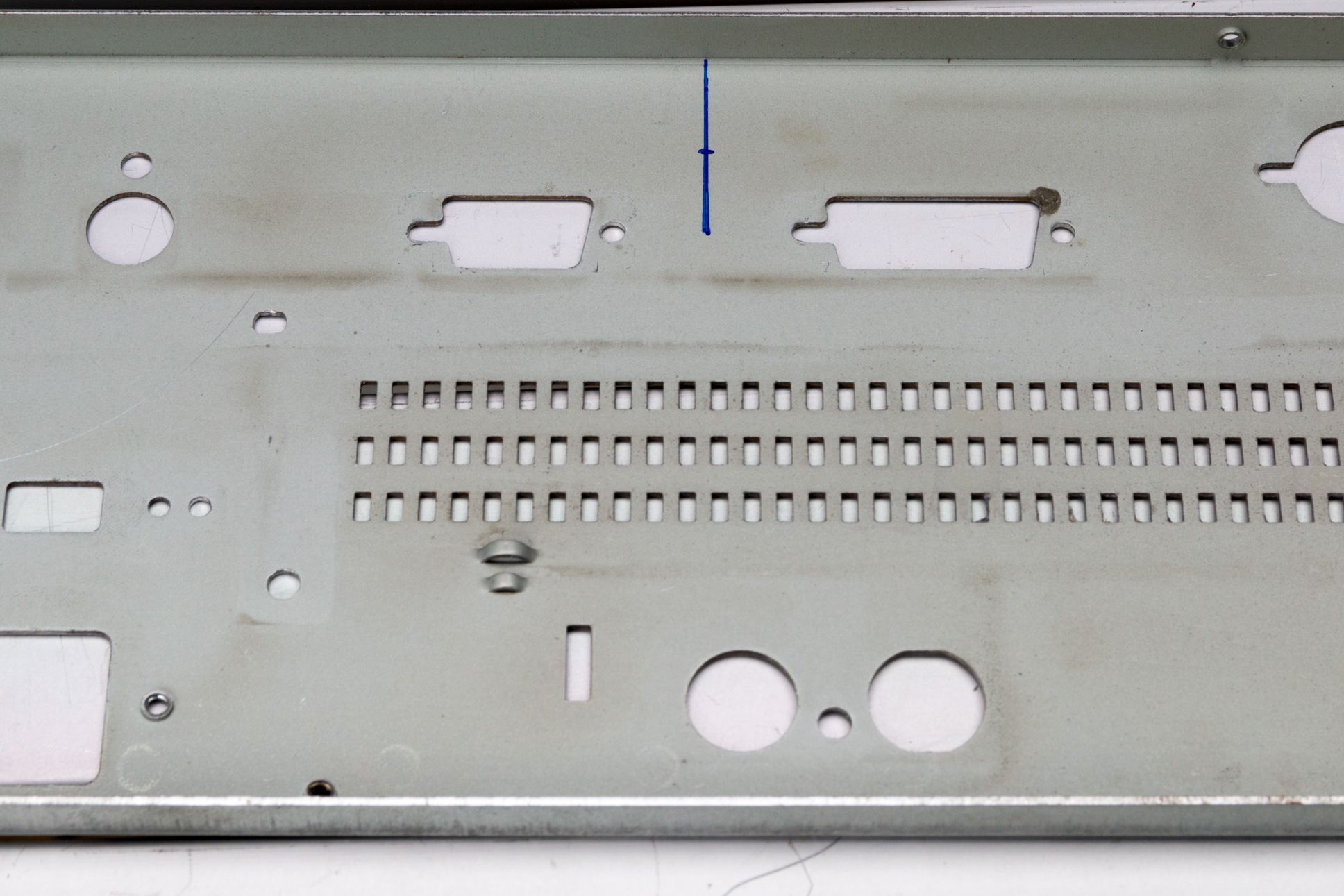Once the panel is removed, turn it over to the bare-metal size. Measure the gap between the RGB and serial connector bolt holes (it should be approximately 20mm) and mark the 10mm centre point. Now draw a line perpendicular to the edge of the back panel up to the centre-point of the two connectors (you can simply use a metal ruler for this, press it against the base of the panel to ensure it is true). Measure from the base of the panel up the centre-line you just drew. Make a mark at 15mm from the base of the panel. The back panel should look like the following photo: